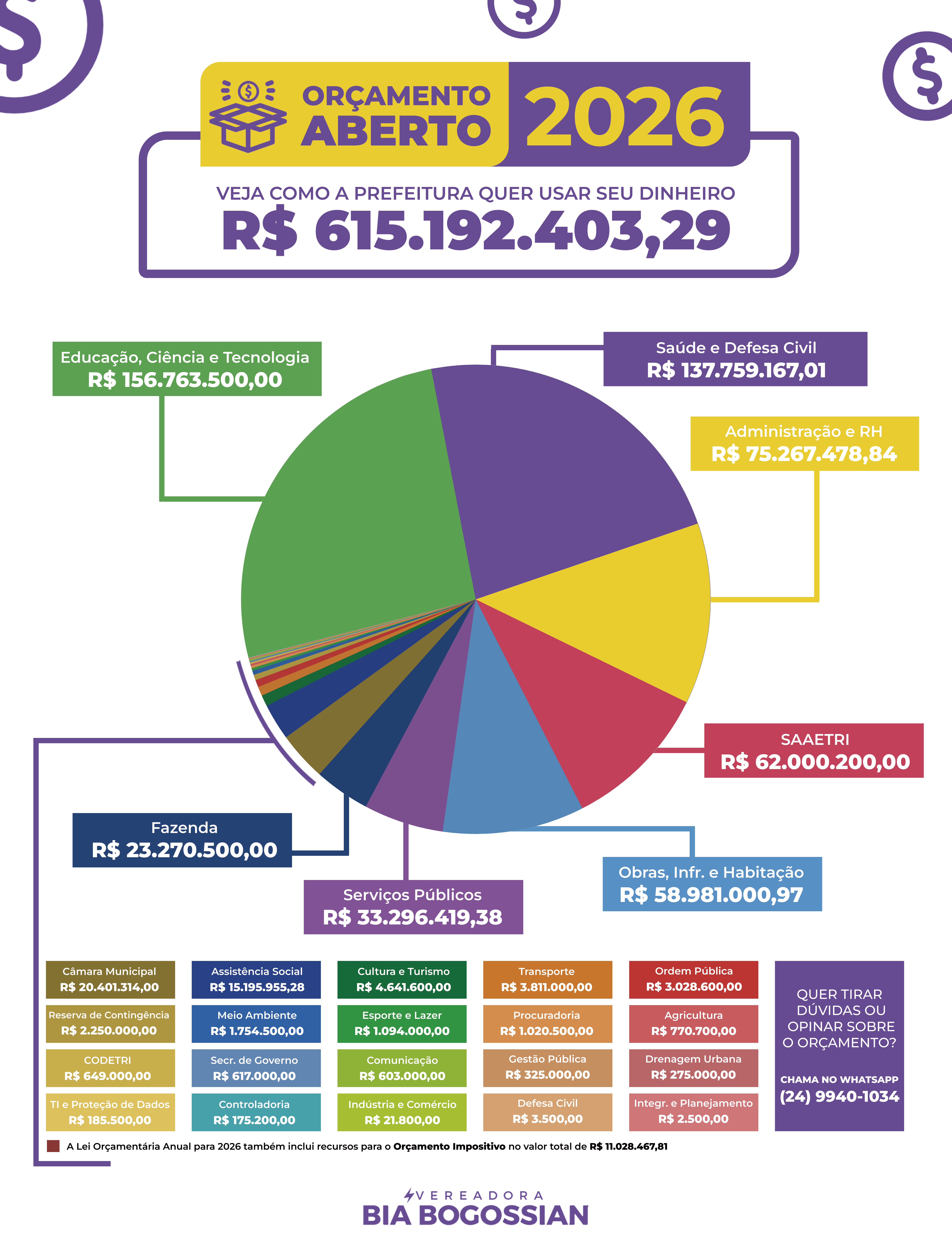 Ao final de cada ano, o mandato vai às ruas de Três Rios para apresentar a proposta da Lei Orçamentária Anual do ano seguinte à população. O objetivo é aproximar cidadãos do debate, apresentando os valores previstos para cada área e ouvindo opiniões que podem ser levadas ao plenário durante a etapa de discussão do projeto de lei.